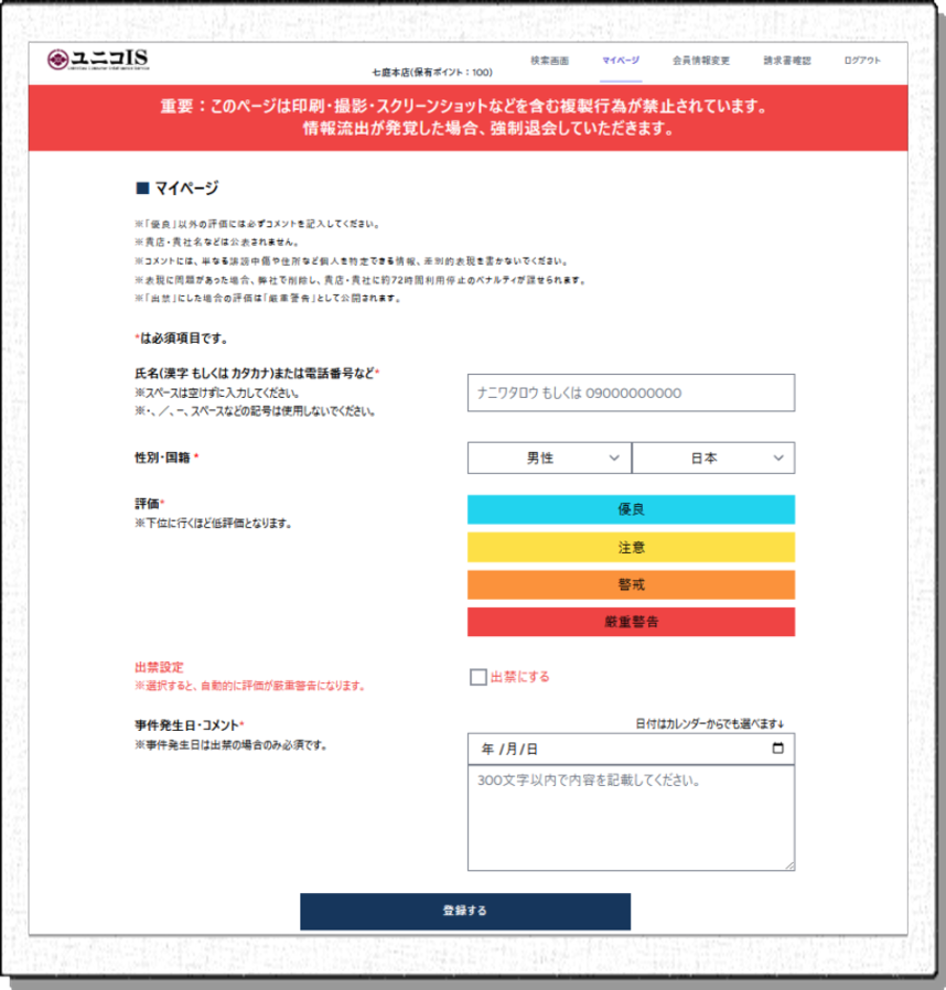 また、独自に「出禁リスト」も作成できます。「出禁」は会員独自の判断として別扱いになり、評価は自動的に「厳重警告」になります。また、同チェーンやグループ会社内などで「出禁リスト」を共有することも可能です。