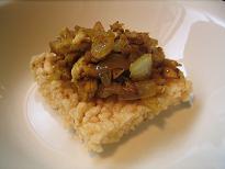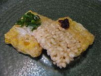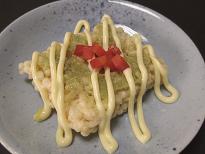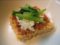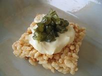 これは揚げたおこげに薄くワサビを塗り、上からマヨネーズをかけ、天火かバーナーで表面を炙ります。ワサビは熱に弱いので一気に焼いて下さい。