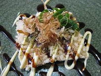 ご想像の通り、おこげにカツオ節・青海苔・ネギ・紅生姜などを乗せ、ソースとマヨネーズで飾り付けます。