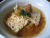 おこげに花カツオをどっさり練り梅を乗せ、薄目のダシをかけます。ワサビは合わないので添え物はネギや三つ葉、カイワレ大根などが良いでしょう。