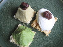 左上は「きんとんおこげ」。薩摩芋を裏ごしし、砂糖を加えておこげにトッピング。右はおこげにバニラアイスを乗せたものです。左下は「ずんだおこげ」。東北の「ずんだ餅」同様、枝豆をすりつぶし、白味噌や砂糖と混ぜて。おこげのかすかな塩味が甘みを増幅します。 |