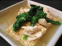 豆乳をダシで適度な味に割り、軽くトロミをつけてあとは、おこげと青味を添えるだけ。