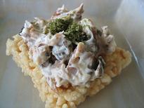 これはお勧めできます!! 塩サバ(生でもOK)を軽く焼き、細かくほぐしてマヨネーズとあえて、おこげにトッピング。青海苔などを飾ります。