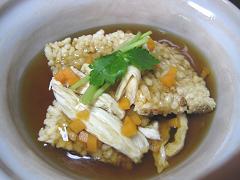 ダシあんかけの一種ですが、具材に湯葉を使ってみました。湯葉は上に飾った方が豪華に見えるのですが、揚げたおこげを湯葉で包み、その上からアンをかけると、見た目が面白く、表面はツルッ、中はサクッとした食感になり、様々なコクや香りが一度に楽しめます。 |